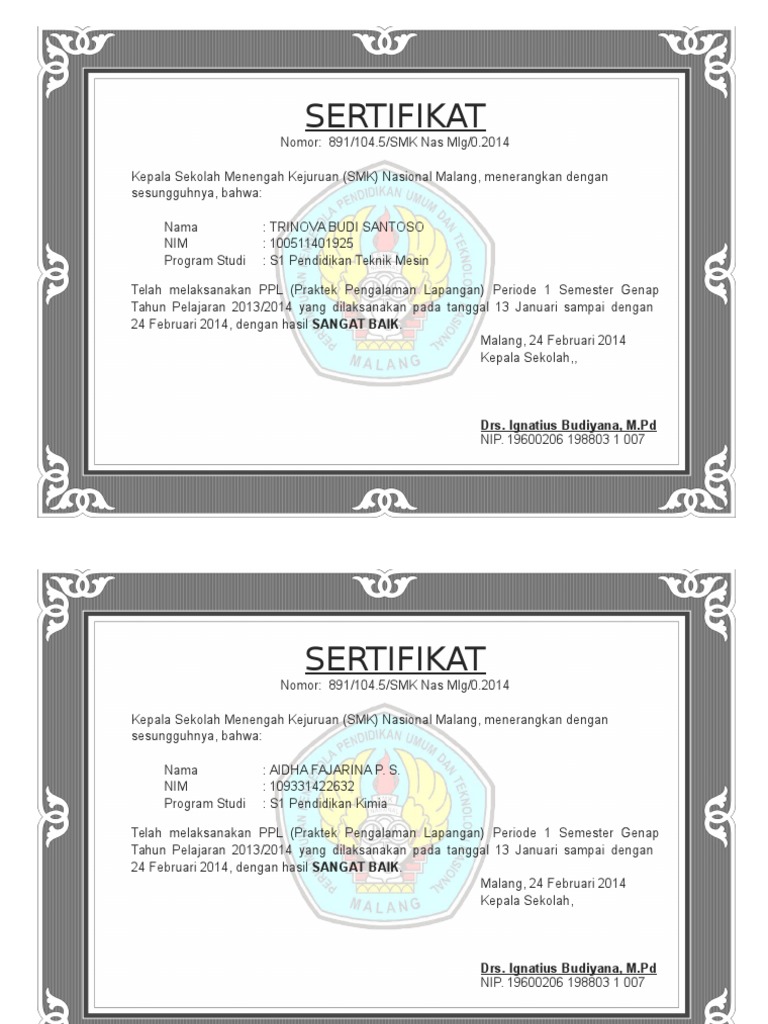 Lainnya dari sertifikat ditulis oleh : Pasalnya, anggota satpam wajib memiliki sertifikat pendidikan dasar (diksar) gradapratama dari pihak kepolisian yang dikelola setiap badan usaha jasa. Sertifikat kecakapan khusus nomor :. 6 contoh sertifikat tanah yang berlaku di indonesia ini perlu anda ketahui. Sertifikat contoh sertifikat indonesia malaysia. Contoh file kosongan pertama ini untuk desain sertifikatnya kamu bisa lakukan editing dengan berbagai versi dari ms word baik dari 2007 sampai dengan 2019, untuk itu tunggu apalagi silahkan. Memanfaat template online ms word 2007 untuk. Simak informasi lengkapnya dengan cara membedakan surat yang palsu diartikel ini. Sertifikat untuk anak magang atau pkl atau prakerinfull description. Sertifikat tanah merupakan surat tanda bukti kuat mengenai data fisik dan data yang termuat di dalamnya. Sertifikat yang bisa kami buat 21. Sertifikat ssl dapat mengalami beberapa kesalahan. Savesave contoh sertifikat for later.